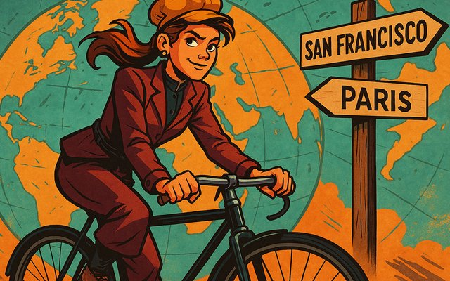 Annie travels across the United States to San Francisco. Then she travels to Japan on a ship. From there, she visits China, India, Egypt, and Europe. In France, she cycles across the country. Then she takes a ship to Britain. After that, she returns to the United States.